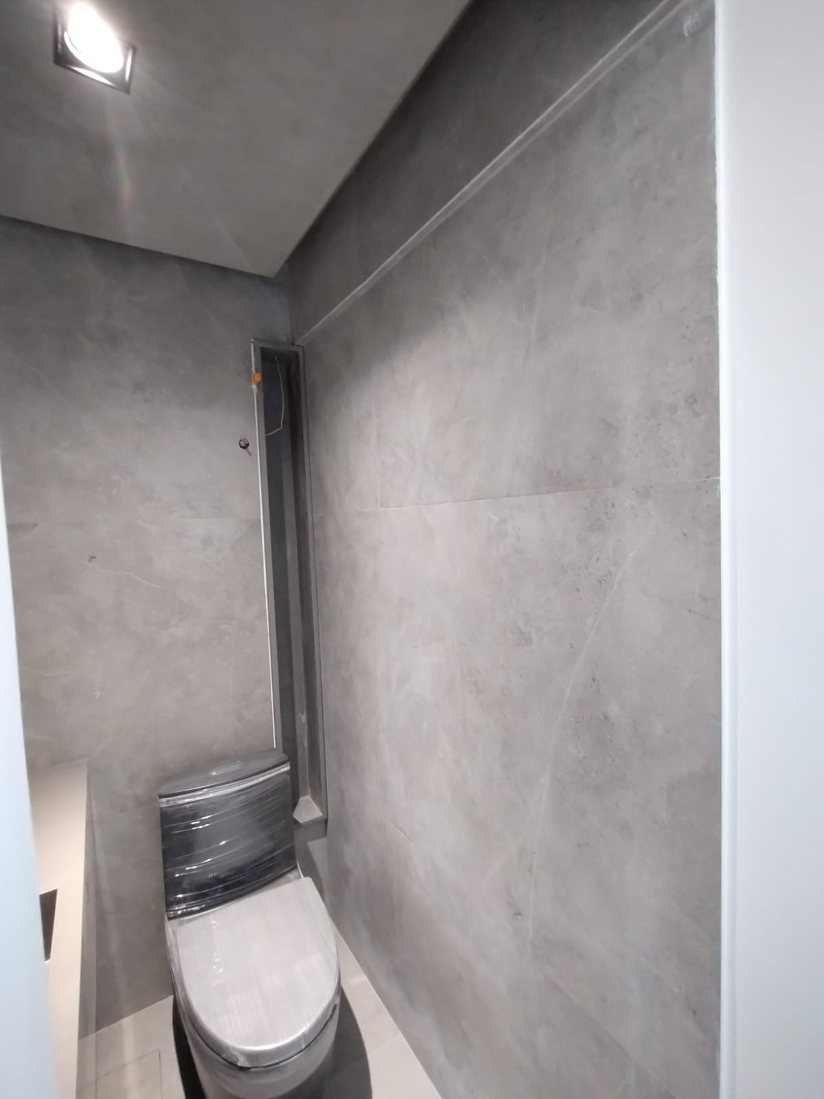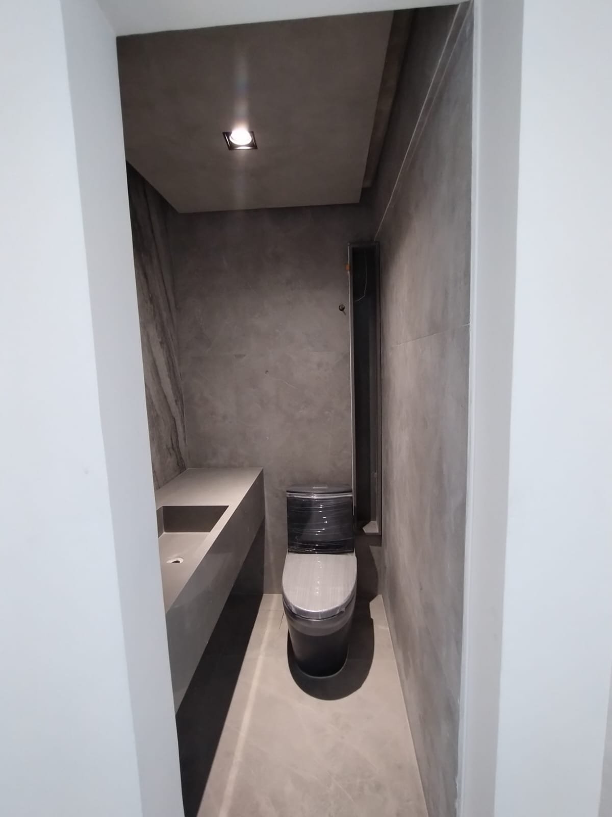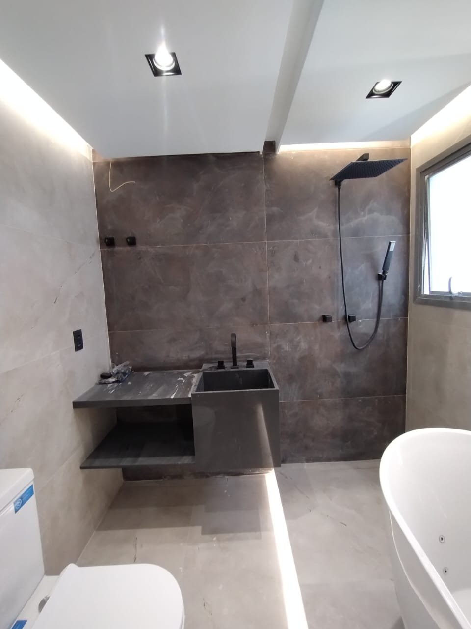 Solução personalizada que utiliza ralos ocultos e iluminação linear em LED embutida nos nichos. A bancada em quartzo esculpido atua como ponto de destaque, otimizando o espaço e transformando o momento do banho em uma experiência de spa particular. Cada acabamento foi escolhido para unir estética minimalista à funcionalidade máxima.