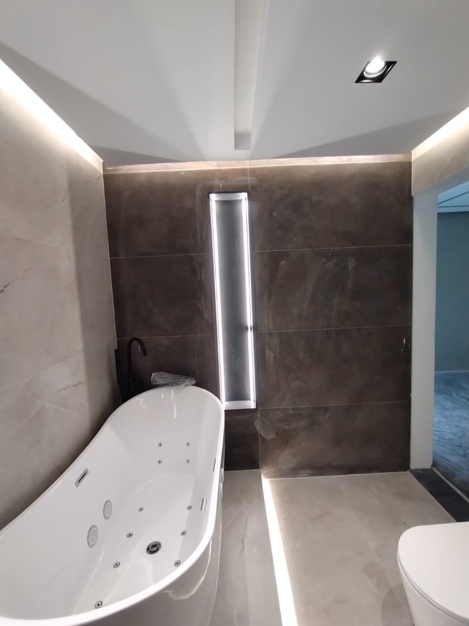 Detalhes de um banheiro de alto padrão com foco em acabamentos premium e iluminação cênica.